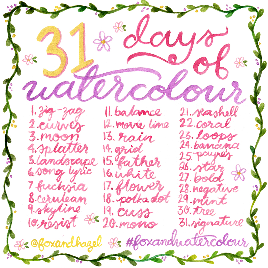 It’s a new month, which means a new watercolour challenge! There was so much response to last month’s challenge, that I knew there was no way I couldn’t do it again. You guys are the reason I’m loving this new & fun reason to paint every single day. If you are new to the challenge, you can see last month’s set of prompts here, and check out the hashtag #foxandwatercolour on Instagram to see what everyone created. So many amazing artists showed up and there were over 2500 photos shared throughout the month! I can’t wait to see what happens next.