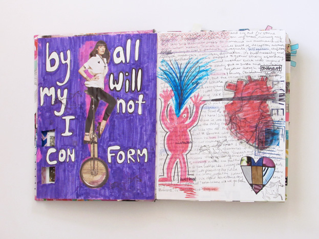 I’ve always been creative and from a young age I put down “artist” as my lifelong career goal. That goal took a lot of different forms over the years, even going so far as to being accepted into an art school in Vancouver. Life doesn’t turn out how you planned and I ended up not attending, but in return I married the love of my life and started a fantastic life together. About a year after getting married (maybe less) I somehow ended up buying a copy of The Journal Junkies Workshop: Visual Ammunition for the Art Addict. After choosing to not attend art school, I was dying for finding a new way to create and express myself outside the constructs of typical art (paintings, drawings, etc) I had spent 6 months working religiously on completing my portfolio for submission and was burnt out on large scale projects. The idea of art journaling appealed to me as I have always been a voracious journaler, and it appealed to my need for visual stimulation.