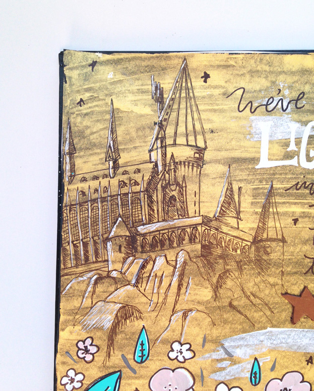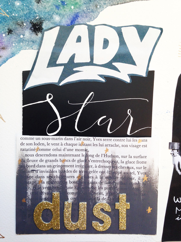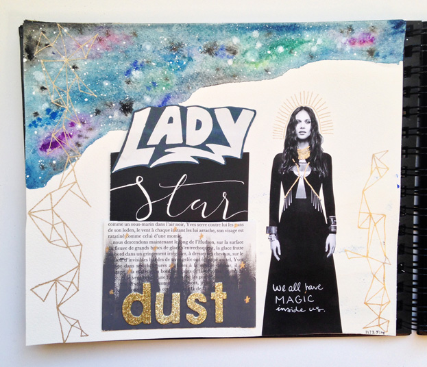 I finally had to add in some watercolour paper because I was feeling so restricted by the black. The galaxy sky is easily my favourite part. Well, I do also like my girl friend up there,