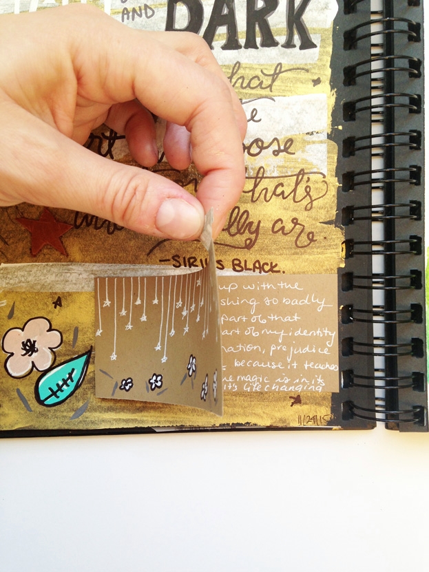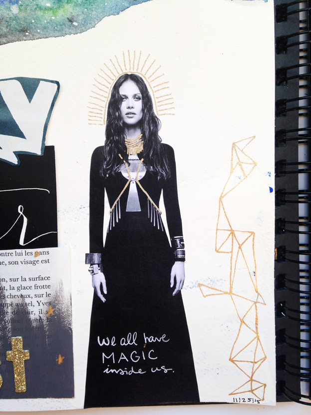 The black pages in this journal have been challenging me to really push myself beyond what I instinctively want to do with black – add white and metallics. At least I went away from the black background on this page, if not away from the gold.