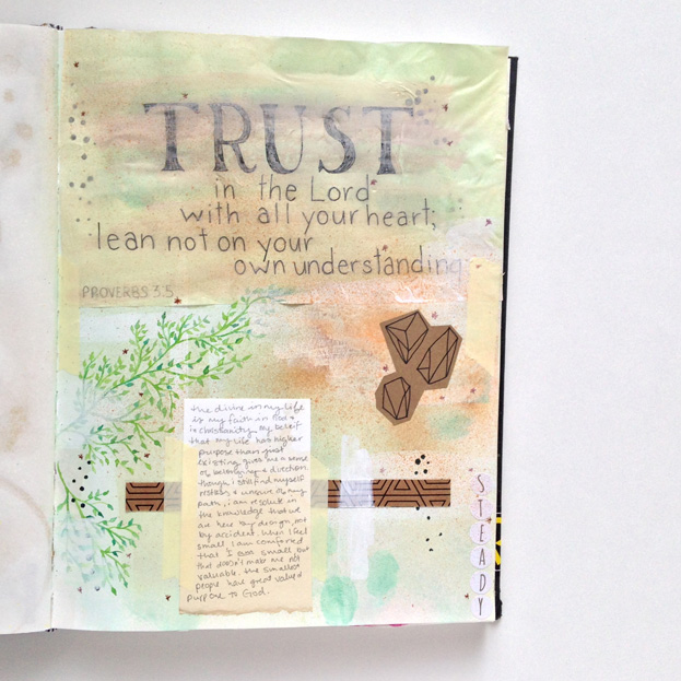 At the end of it all, I find a lot of peace and calmness when I get a chance to work on either my art journal or other artworks. I always think back to how people describe themselves and when they are most inspired to create: early morning, afternoon, middle of the night, etc. As I’ve started this art journaling process I’ve discovered that I don’t really have a specific time I like to create. Any time is the time to create. I do end up doing most of it late at night (kids, man) but I’m often inspired throughout the day with ideas & techniques to try out. Whether or not I get to them right away is another story š