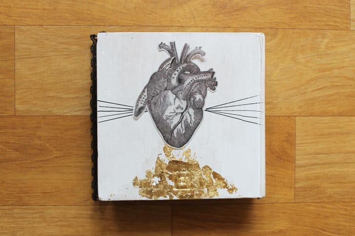 This anatomical heart matte medium image transfer had been kicking around in my stash for a while, and it finally found it’s home on the back of Vanessa’s zine! And some more gold leafing. Whoever added the lines was a genius too – it looks so awesome all together!